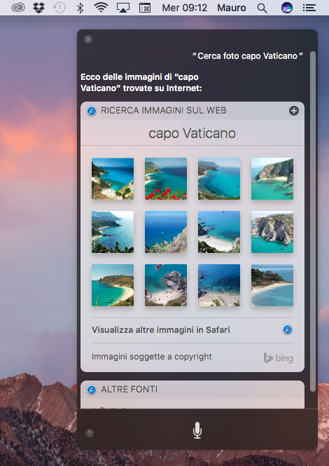 Interessante è la possibilità di cercare foto e altri elementi su internet. Scrivendo ad esempio: “Cerca foto di Tropea” verranno visualizzate fotografie individuate sul web o nell’applicazione Foto.