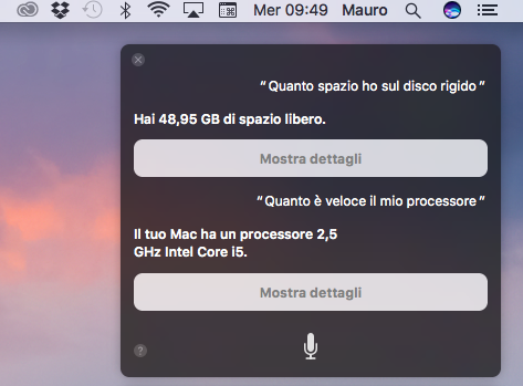 Siri su Mac accetta anche domande e richieste “tecniche” del tipo: “Quanta RAM ha il mio computer” (risponderà, indicando se vogliamo ulteriori dettagli), “Quanto spazio ho su iCloud?”, “Quanto spazio ho sul disco rigido?”, “Quanto è veloce il mio processore?”. Siri può aumentare la luminosità dello schermo, attivare il salvaschermo, attivare e disattivare il collegamento Wi-Fi, aprire le preferenze di Sistema, applicazioni ma (almeno al momento) non sembra invece in grado di rispondere a domande del tipo: “Qual è la risoluzione dello schermo?”, “Quanti schermi ho?”.