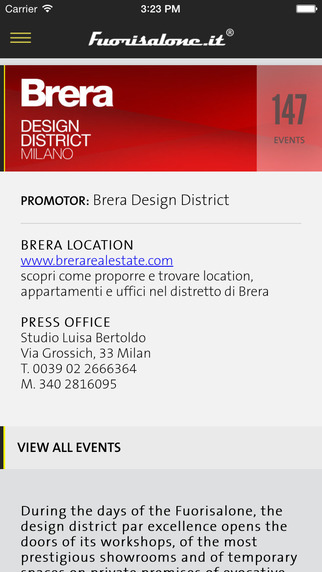 Per non perdersi nemmeno uno degli appuntamenti del Fuori Salone 2015 fondamentale è l’applicazione Fuorisalone 2015: l’app consente di avere sempre a portata di tap l’agenda degli eventi, con gli indirizzi, le descrizioni, le immagini degli appuntamenti della settimana del design e i percorsi per raggiungerli, una sezione dedicata alle “Zone del design” per capire meglio quali sono i distretti più interessanti tra il Brera Design District, la Tortona Design Week, Ventura Lambrate e altri ancora, una sezione dedicata agli eventi speciali di questa settimana e la galleria di immagini in tempo reale dagli eventi.