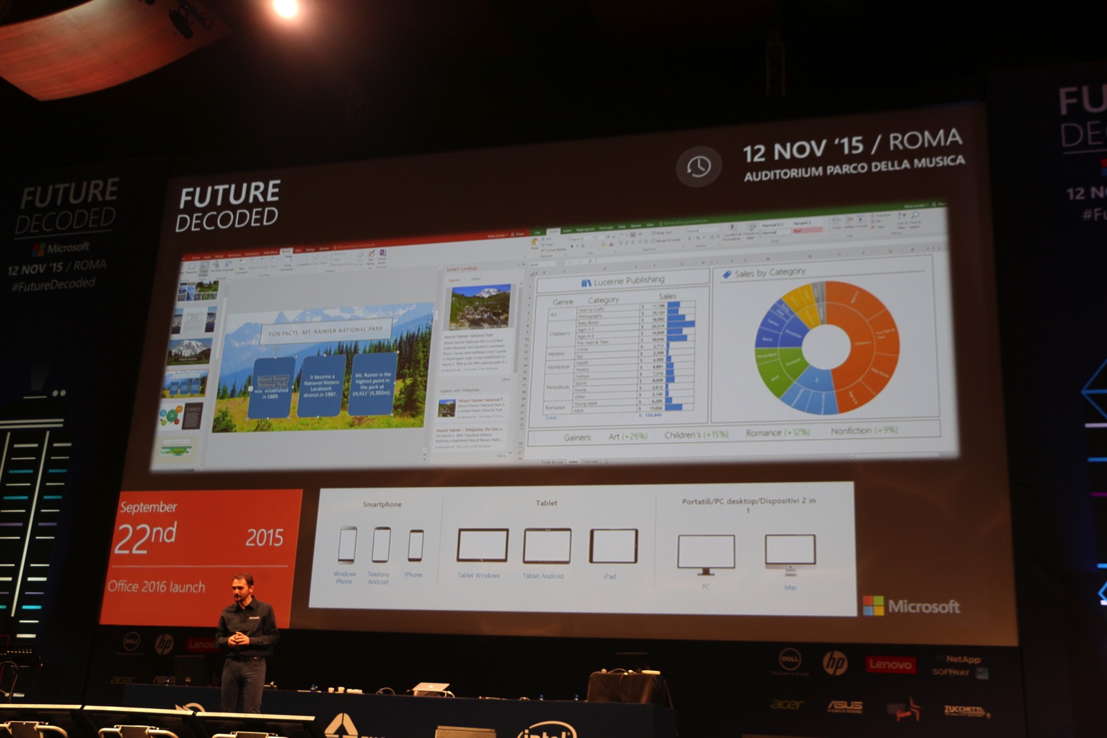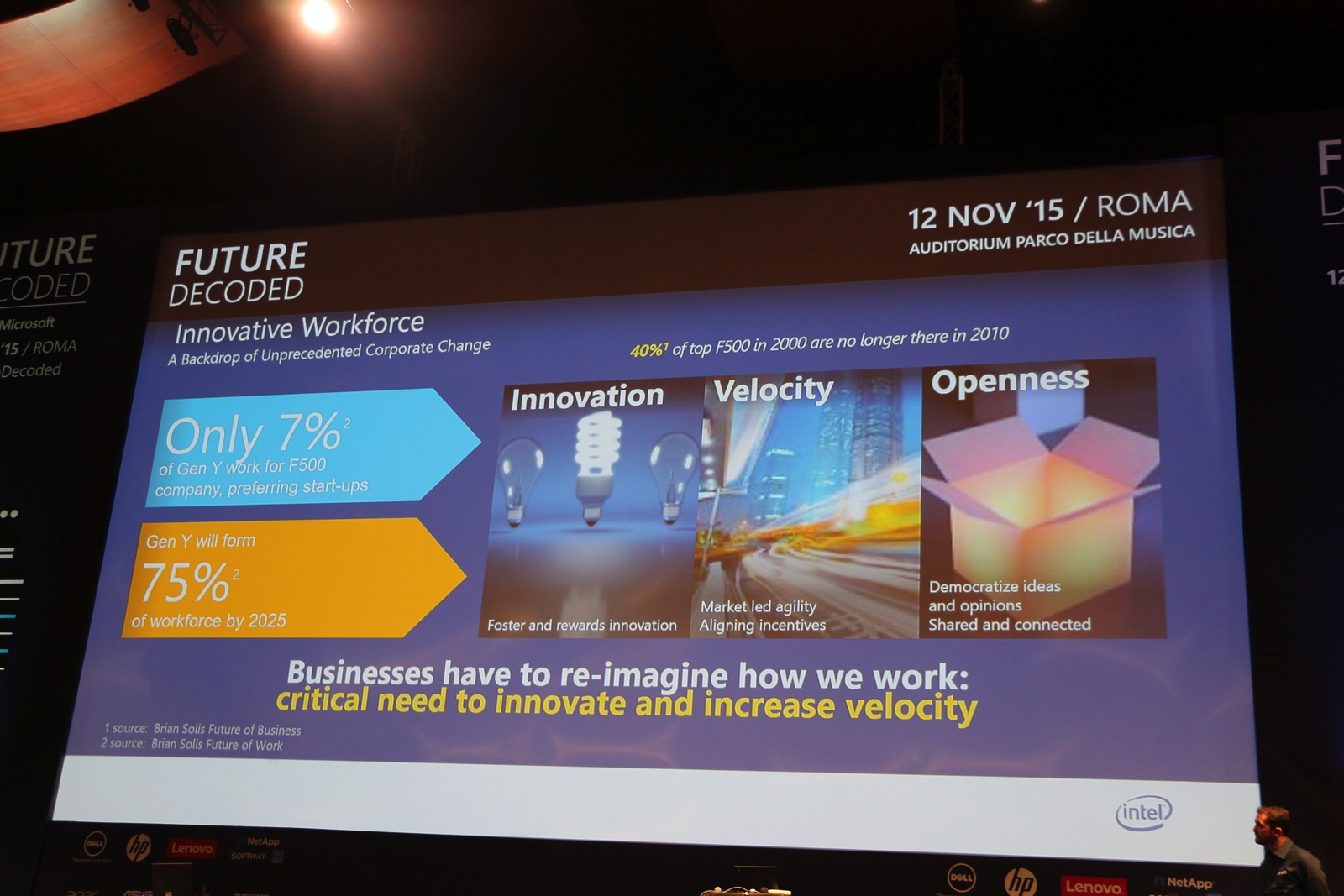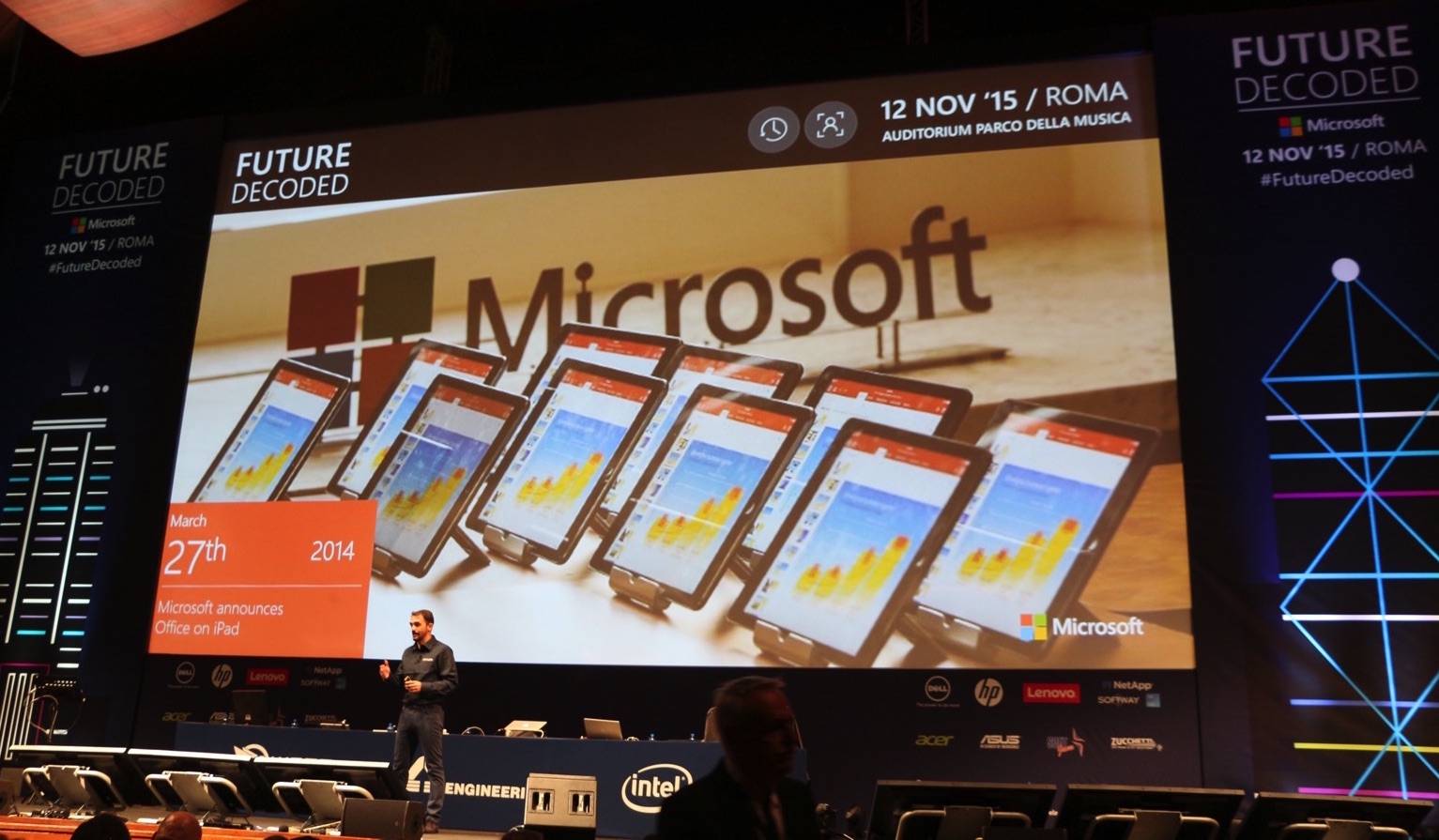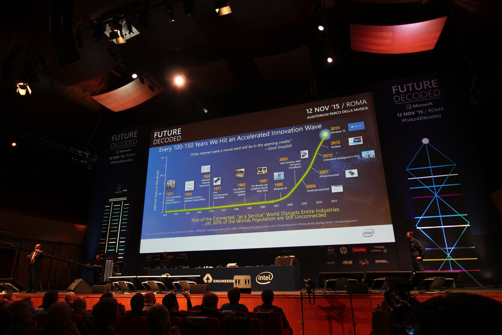 Sul palco Maurizio Riva di Intel mostra i punti di svolta della tecnologia di oggi e dell’uso che ne facciamo. Ovviamente si parla di prodotti Intel e Microsoft ma anche della grande rivoluzione che ha portato iPhone nel 2007.