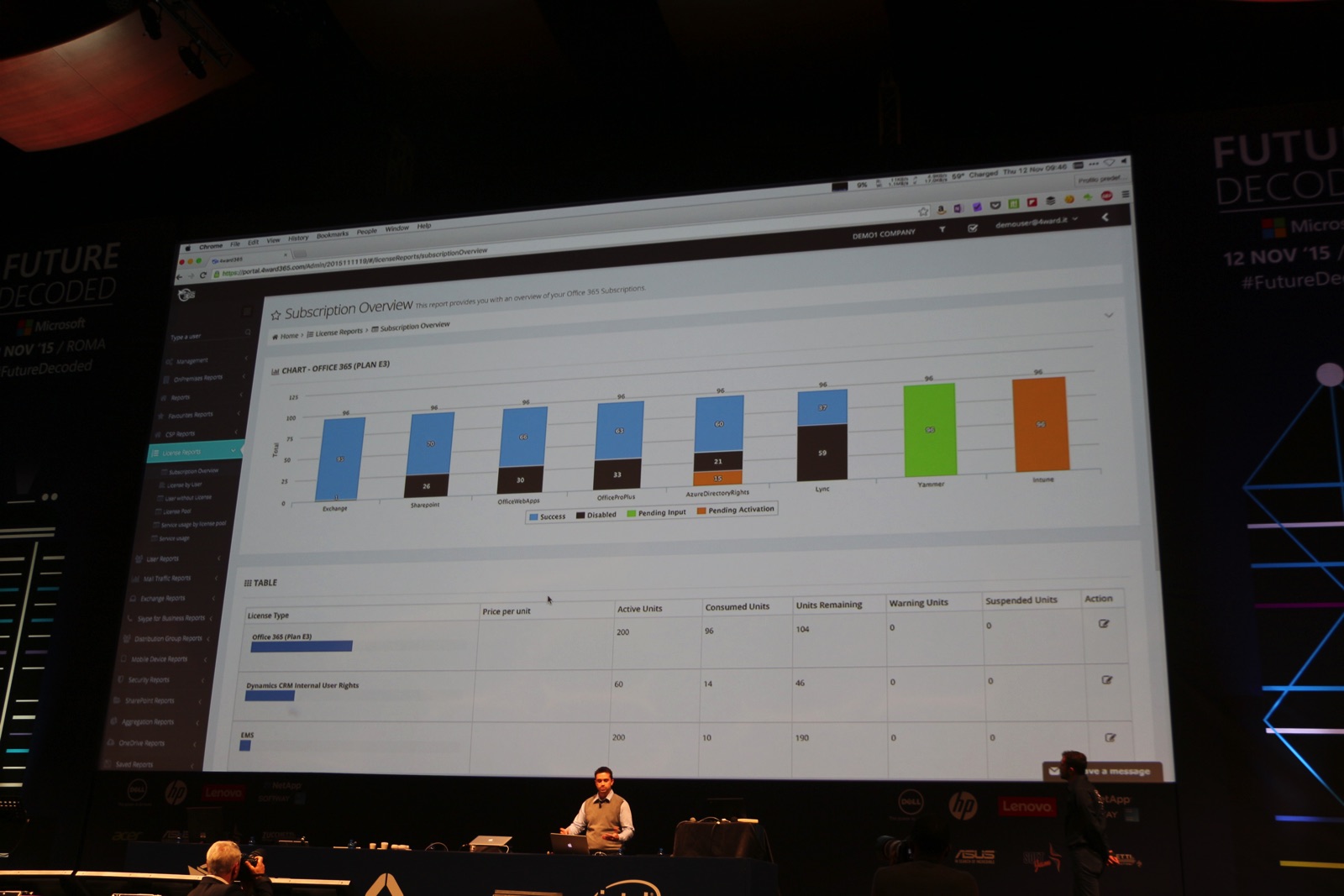 Sul palco arriva prima David Mascarella che presenta 4Ward, partner di Microsoft Italia, con l’aiuto di Ivan Fioravanti che interagisce sul Mac e parla del radicale cambiamento radicale dell’azienda in prospettiva cloud: la soluzione cloud-in-a-box è installabile in meno di due ore con architettura scalabile e permette backup e installazioni sul cloud, l’applicazione 4ward365 è ideale per analisi e reportistica e delega amministrativa anche per un subset di utenti.