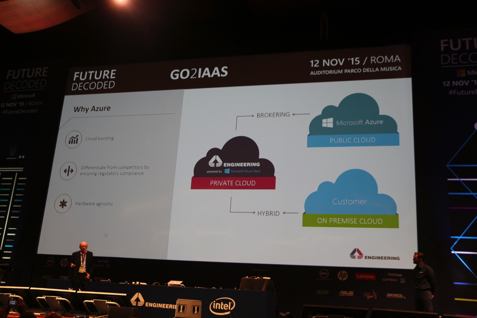 In Italia la soluzione è stata implementata da Engineering e sul palco sale il CEO Orazio Viele: “Quella di microsoft e’ una mutazione genetica e lo è pure quella di Engineering che sta agendo sulla ristrutturazione con Go2Cloud trasformando i suoi servizi in software cloud nativo disponibile su mercati pubblici. Il futuro e’ interagire anche con le strutture cloud dei clienti. Il cloud non e’ solo una discontinuità nel discorso tecnogico ma anche nel modello di business. Microsoft lascia la libertà ai partner di erogare i propri servizi.