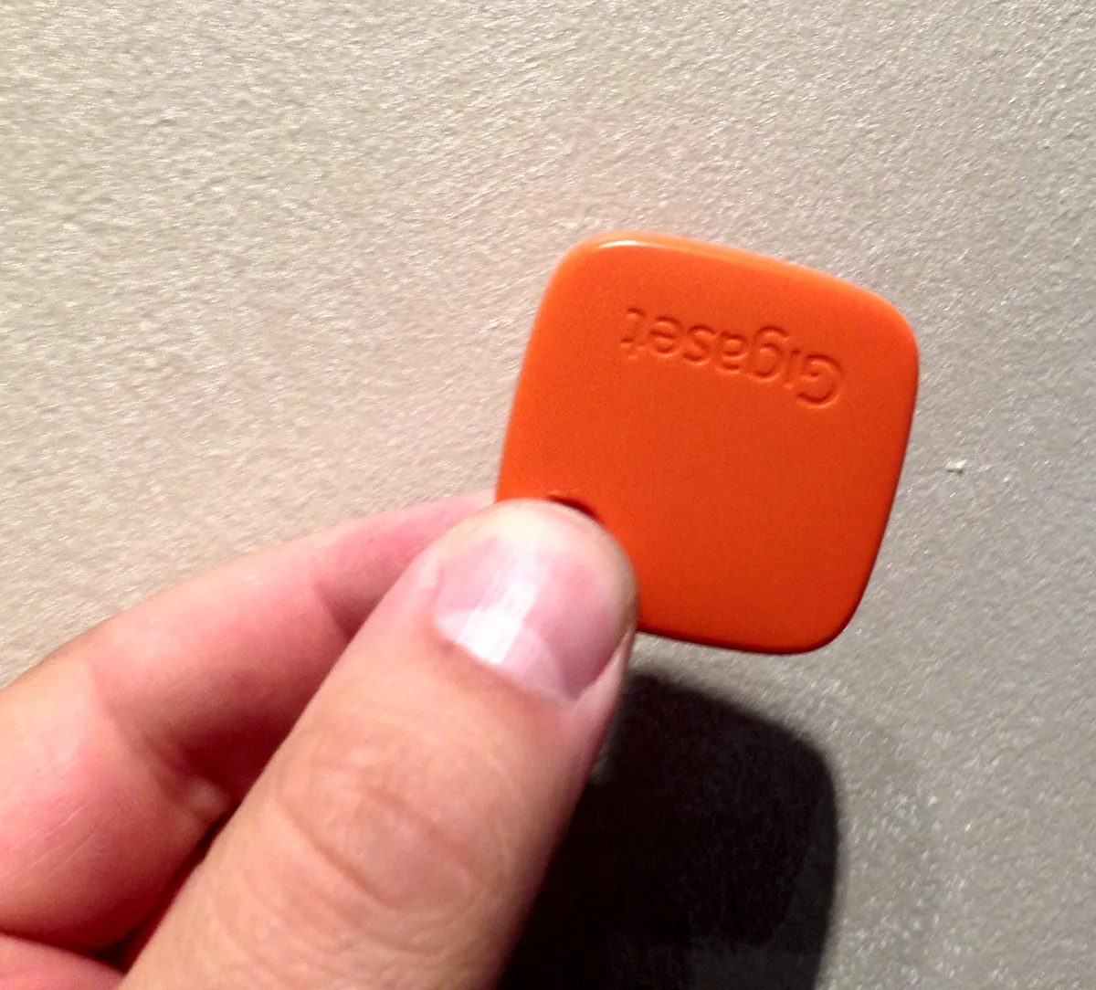 Esteticamente si tratta di un piccolo parallelepipedo di appena 37 mm per lato e 9 mm di spessore (per 12 g di peso), che mostra, in uno dei vertici, un passante per agganciarsi a borse, tracolle, ganci e chiavi. Fuori dalla scatola, che contiene anche una presa di plastica di sicurezza per impedire il funzionamento della batteria prima dell’apertura, si presenta come un semplice accessorio colorato, senza alcun pulsante e con la scritta Gigaset in sovraimpressione nella parte frontale, a cui corrispondono quattro viti di chiusura nel retro (per assistenza, immaginiamo).