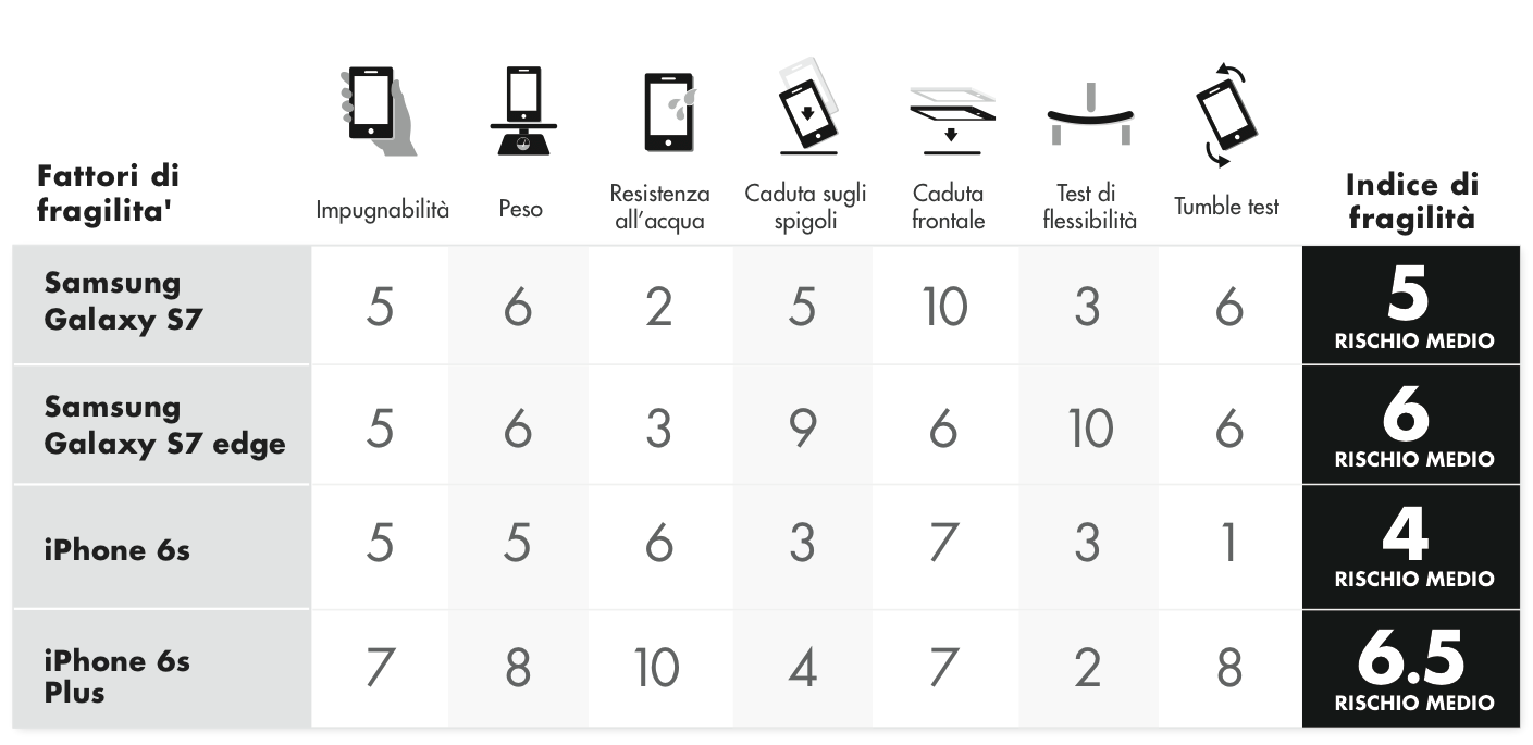 Nei test successivi però gli iPhone 6s hanno la meglio: nelle cadute ripetute e nella caduta sullo spigolo i Galaxy S7 si rompono molto più facilmente, mentre il modello che resiste più di tutti a cadute ripetute è iPhone 6s. In calce in questo articolo riportiamo le pagelle per ogni modello realizzata da SquareTrade: il voto più basso indica probabilità inferiori di danni e quindi è preferibile.