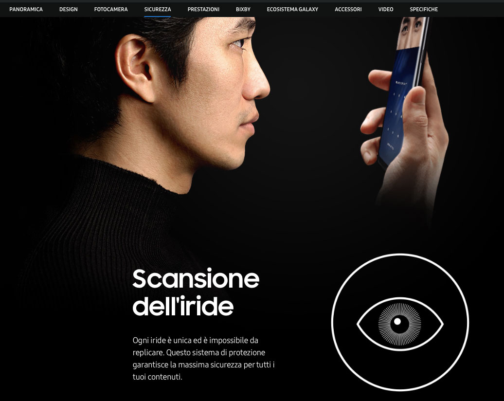 Lo smartphone in questione offre cinque meccanismi di sblocco: scansione iride, riconoscimento del viso, impronte digitali, password e PIN (o segno con le dita). Lo sblocco con l’iride è utilizzabile, tra le altre cose, anche come forma di autenticazione biometrica per accedere al servizio Samsung Pay, offrendo un metodo in teoria sicuro e più conveniente di pagare.