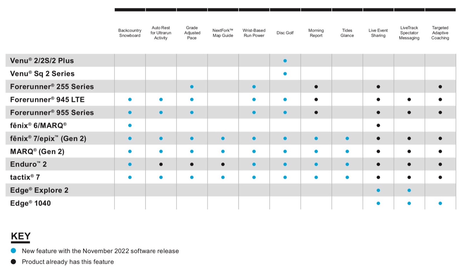 L’aggiornamento interessa la serie di sportwatch fenix 7, epix (seconda generazione), tactix 7, Enduro 2, MARQ (seconda generazione), Forerunner 255, Forerunner 955 e, prossimamente, anche i ciclo computer della serie Edge 1040 e Edge Explore 2.