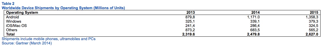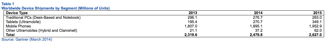 Le previsioni Gartner 2014 indicano un miglioramento delle spedizioni totali di dispositivi rispetto al 2013: la quantità di computer, smarpthone e tablet e ultramobile crescerà del 6,9% per un totale di 2,5 miliardi di unità, superando così la crescita del 2013 pari al 4,8% per un totale di 2,3 miliardi di unità spedite.