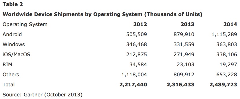 Sul breve periodo l’acquisizione di Nokia da parte di Microsoft non comporterà miglioramenti significativi: per il 2013 è previsto un calo del 4,3% nella quota di mercato Microsoft dei sistemi operativi ma è già prevista una inversione di tendenza per il 2014. Android rimane il sistema operativo dominante con il 38% delle spedizioni nel 2013, mentre iOS insieme a OS X sono terzi.