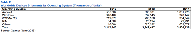 Per quanto riguarda invece la piattaforma dominante per la prima volta Gartner non prende in considerazione esclusivamente il totale dei dispositivi funzionante con un determinato sistema operativo ma precisa che sta diventando sempre più importante anche per i costruttori la presenza omogenea sui diversi mercati. Così mentre il 90% delle vendite di dispositivi Android è concentrata nel settore smartphone, Big G risulta quasi assente su PC e desktop, allo stesso modo l’85% delle vendite di dispositivi Microsoft è concentrata nel settore dei computer. Sotto questa prospettiva Gartner nota che Apple è la presenza più omogenea tra i vari settori. L’ultima previsione è di più lungo termine: crescerà il numero dei dispositivi di proprietà degli utenti (BYOD) rispetto a quelli forniti dalle società ai dipendenti: si passerà dal 65% del 2013 al 72% nel 2017, un ulteriore indizio che punta sull’importanza del design per l’utente finale anche all’interno delle imprese.