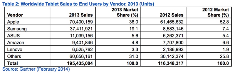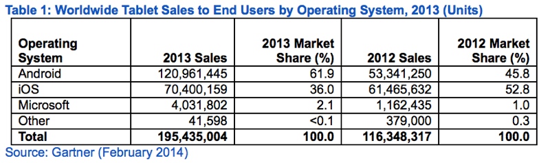 Nel 2013 le vendite tablet sono aumentate del 68%: nelle rilevazioni di Gartner emerge per la prima volta il sorpasso di Android ai danni di iOS: anche se le vendite di iPad sono aumentate, i tablet Android crescono di ben il 127%, diventando così il primo sistema operativo tablet, seguito da iOS con il 36%. Apple rimane comunque il primo costruttore in questo mercato.