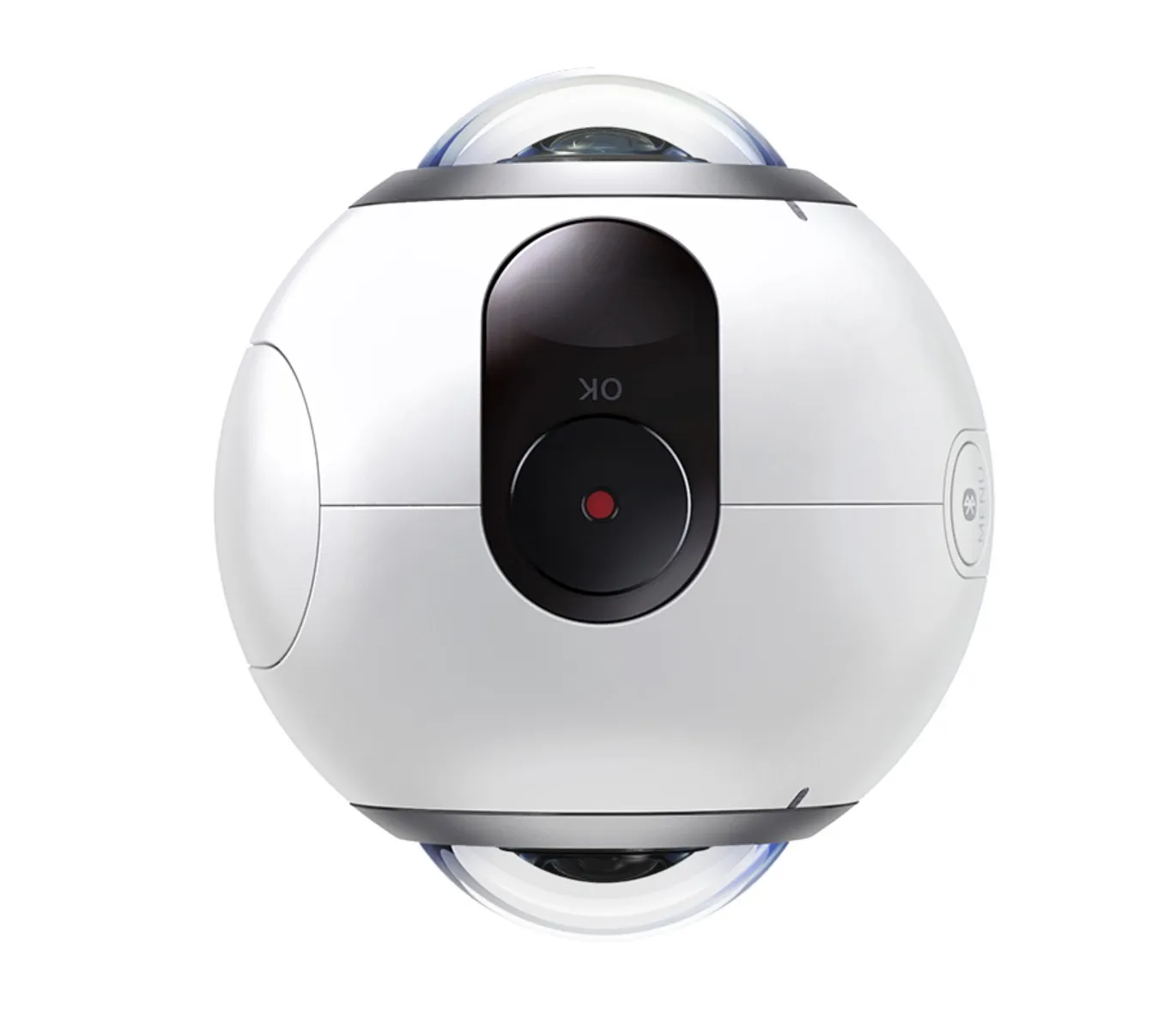 Per via di colore (bianco) e forma sferica, esteticamente ricorda un bulbo oculare, se non fosse che monta una doppia “iride”: sono due infatti le lenti contrapposte con apertura focale f/2.0 in grado ciascuna di catturare un’area di ben 195 gradi, usabili anche singolarmente ma che, grazie ad un automatismo software, permettono di acquisire e montare tra loro foto (da 30 MP) e video (a 3.840 x 1.920 pixel) visibili poi a 360 gradi tramite un’app per smartphone o direttamente con il Gear VR.