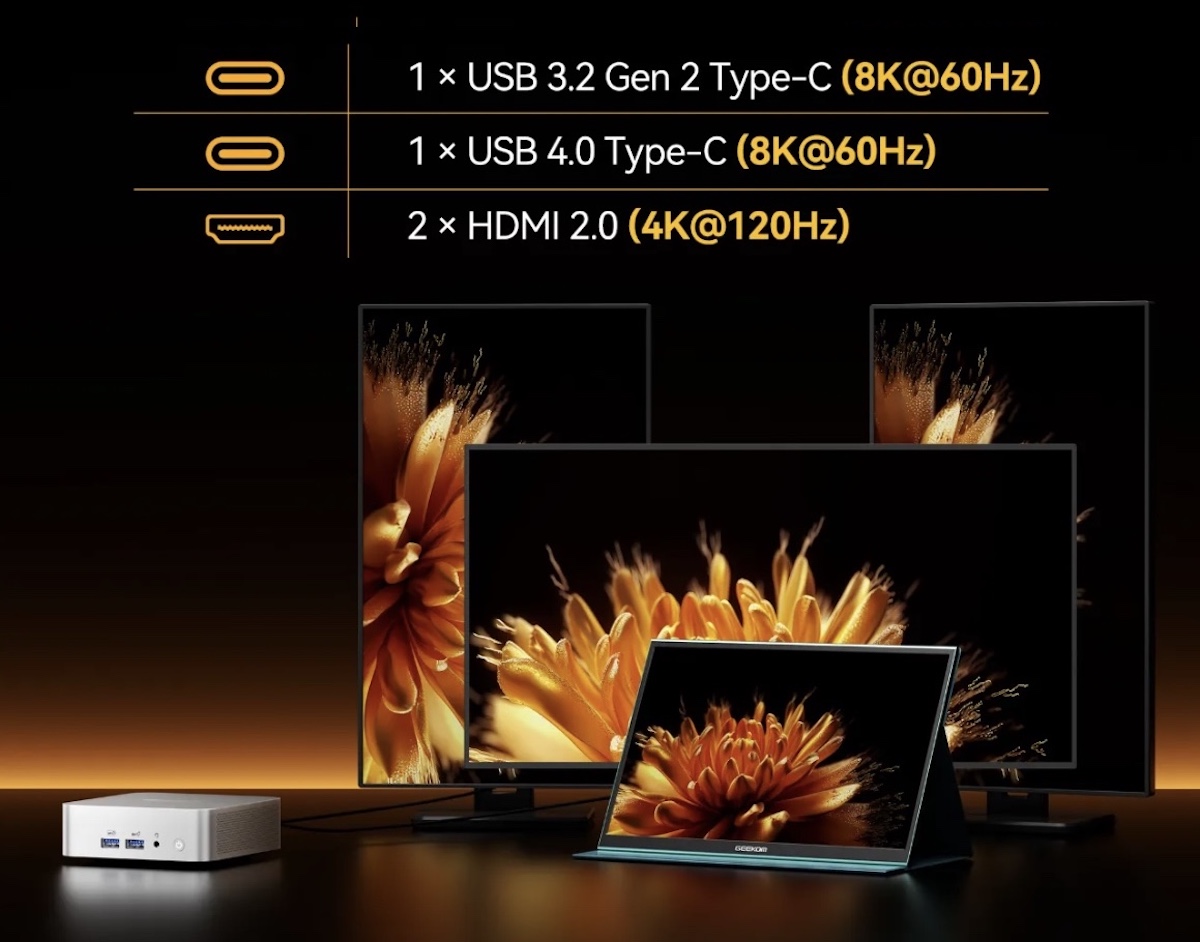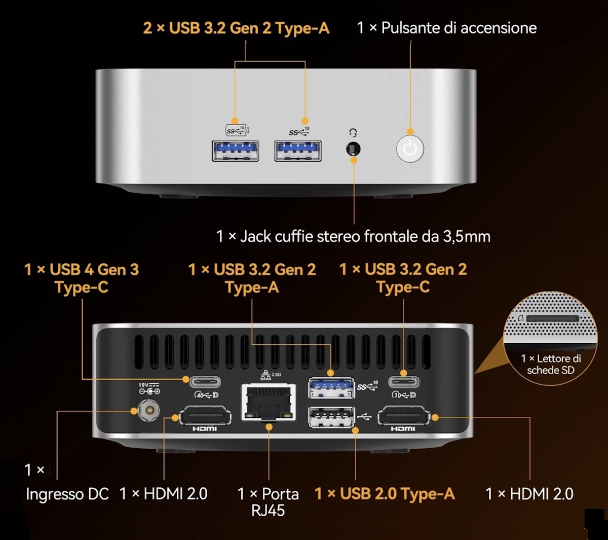 Uno degli scenari d’uso più convincenti per questo mini PC è quello dello smart working evoluto. Le dimensioni ridotte lo rendono facile da collocare su qualsiasi scrivania, o addirittura dietro un monitor grazie al supporto VESA, mentre la dotazione di porte è più vicina a quella di un desktop tradizionale che a un sistema compatto. USB4, USB-C, USB-A, HDMI, DisplayPort ed Ethernet 2,5 Gb permettono di collegare periferiche, storage esterni e fino a quattro monitor 4K, rendendolo adatto anche a configurazioni multi-display per lavoro o trading.