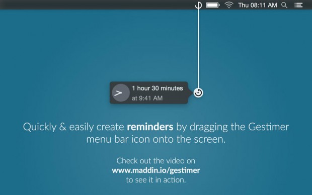 Gestimer è una comoda utility disponibile sul Mac App Store (2,99 euro) con la quale è possibile creare al volo promemoria per vare attività da svolgere quotidianamente. Peculiarità del programma è la presenza di una icona nella barra dei menu: basta cliccare su questa e trascinare verso il basso una sorta di linea; più si tira la linea verso il basso, più si incrementano i minuti nei quali l’evento dovrà essere ricordato (es. tra 10 minuti, un’ora, due ore e così via).