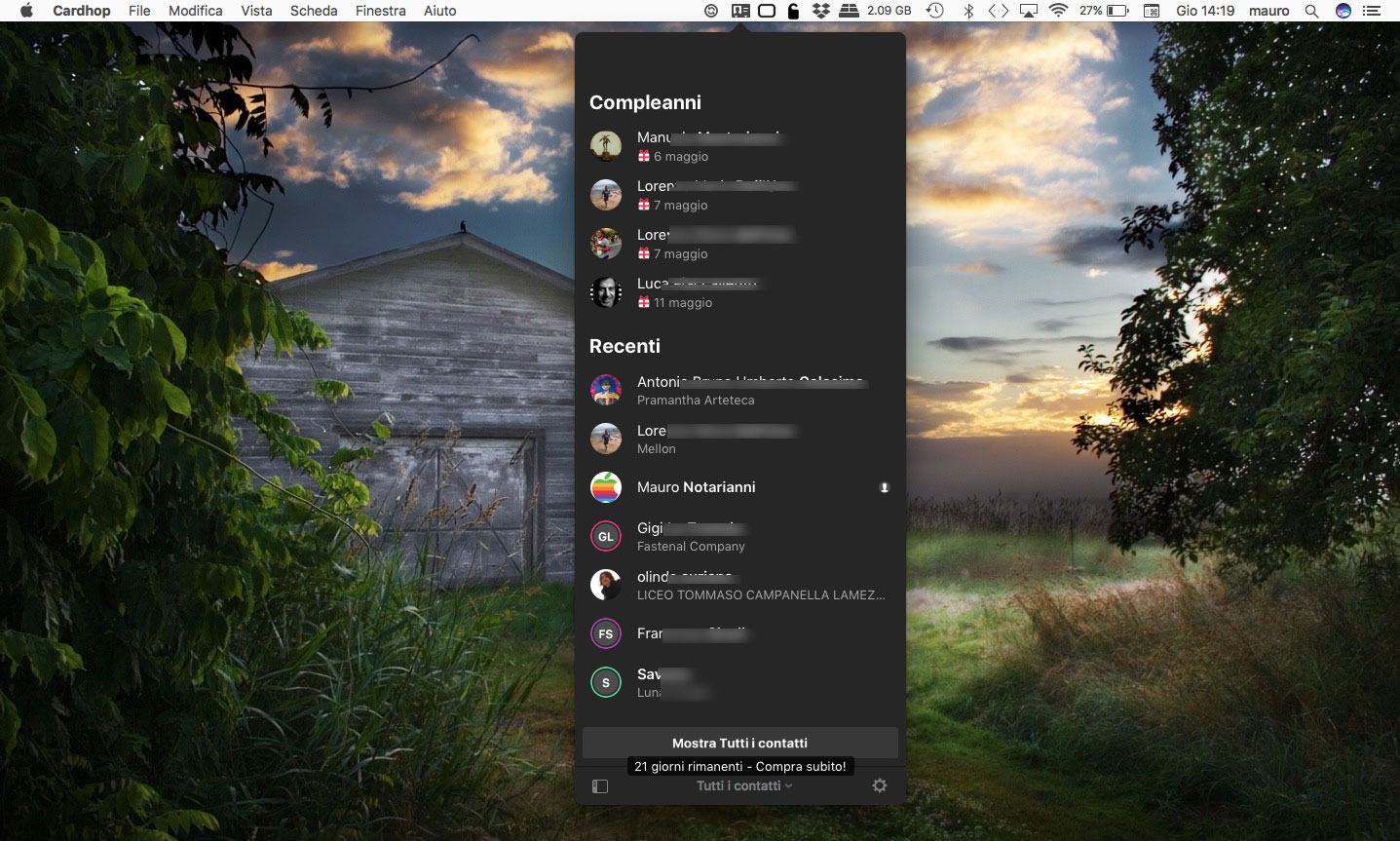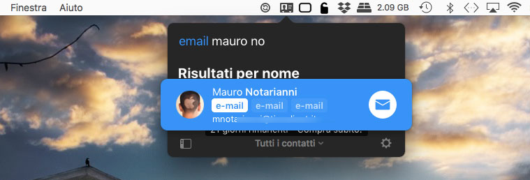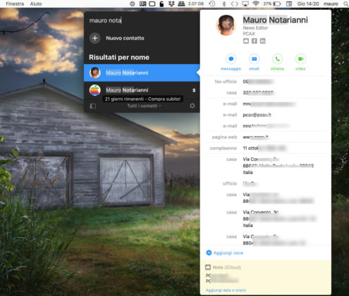 La mini finestra richiamabile dalla barra dei menu mostra i prossimi compleanni e i contatti recenti; è possibile inviare al volo una mail, avviare Messaggi, chiamare e videochiamare digitando le prime lettere del cognome per trovare il contatto selezionato. È possibile “scollegare” la finestra dalla barra dei menu (avere una finestra fluttuante indipendente), visualizzarla sempre in primo piano, cambiare vista, stampare i contatti, creare nuove schede, gruppi, gruppi smart, ecc. È molto facile aggiornare i dettagli di un contatto, avere accesso istantaneo a contatti di vario tipo (sono supportati: iCloud, Google, Exchange e LinkedIn) e particolarmente interessante è il campo “Note” grazie al quale è possibile migliorare i rapporti interpersonali (aggiungendo piccoli dettagli sul contatto, specificando eventualmente anche data e ora di quanto è stata aggiunta la nota).