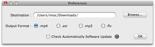 Dal menu delle preferenze dell’applicazione è possibile selezionare il formato di output desiderato: mp4, avi, mp3 , flv e impostare o meno il controllo automatico degli update.