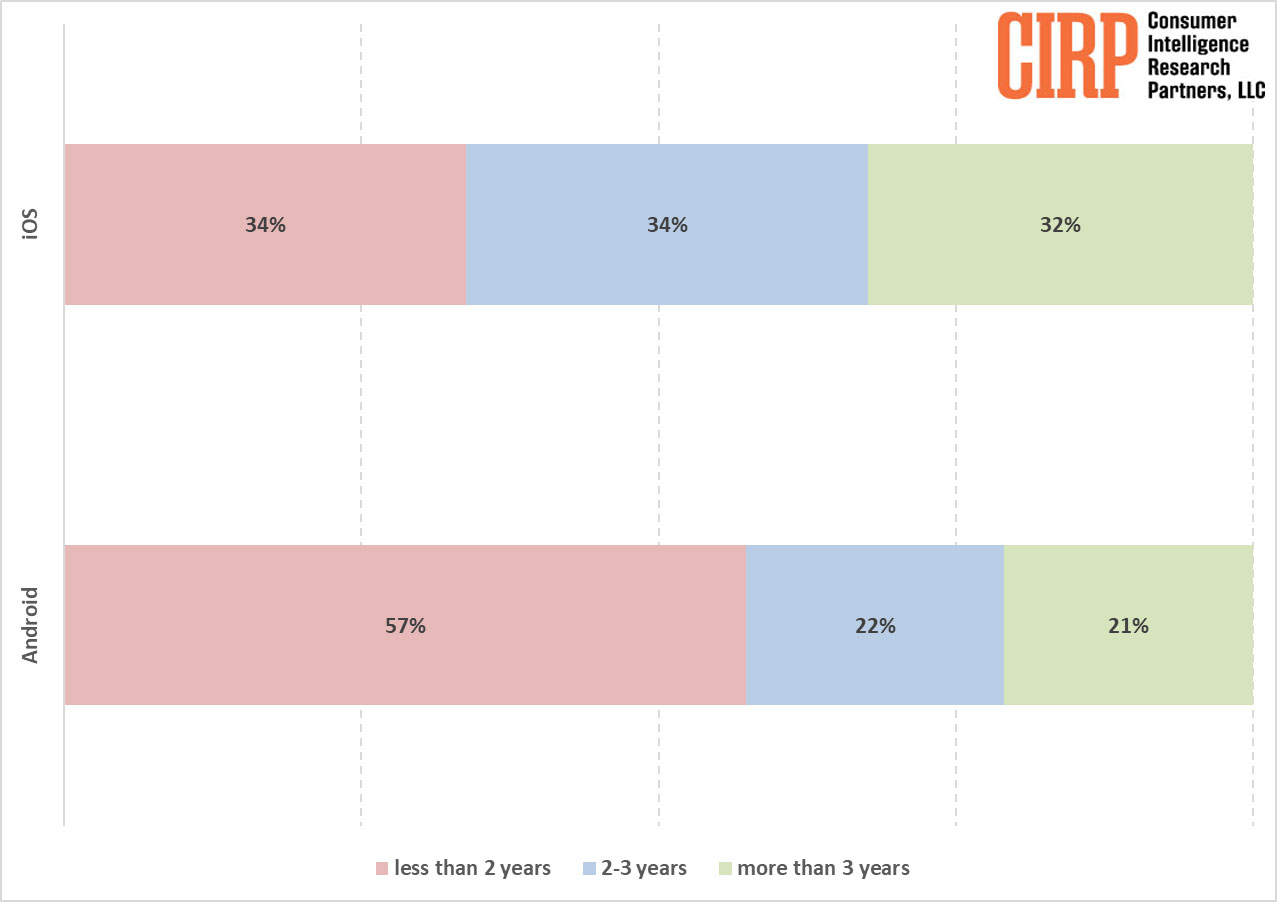 Sfruttando set di dati ottenuti dagli utenti di vari telefoni, CIRP afferma che circa un terzo dei nuovi acquirenti di telefoni che hanno un iPhone resta con quest’ultimo per tre anni o più prima di passare al nuovo. Solo un terzo degli utenti iPhone manda in pensione dispositivi più vecchi di due anni, mentre il 57% dei dispositivi Android usati dagli utenti ha meno di due anni di età.