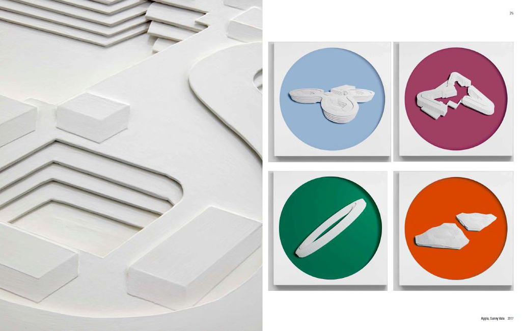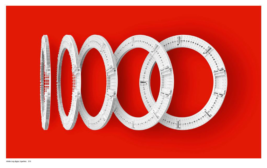 La scultura di Apple Park, così come quella del nuovo Campus Apple Central e Wolfe in Sunnyvale in dirittura di arrivo, sono costruite impiegando legno, alluminio, pannelli in fibra e acrilico, riprodotte nei minimi dettagli a partire ai progetti originali e poi disposte e messe in risalto di fronte a blocchi dai colori forti e accesi. La stessa operazione è stata realizzata anche per i nuovi campus di altri colossi della tecnologia, in arrivo nei prossimi anni o già in costruzione, tra cui le sedi di Google, Facebook, Microsoft e altre società ancora.