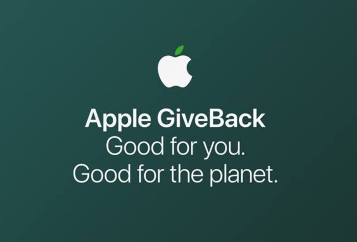 In questo articolo riportiamo anche le fotografie pubblicate da Storeteller che mostrano la campagna Apple GiveBack per la restituzione e riciclo dei prodotti di Cupertino usati, logo Apple con foglia tinta di verde, così come le divese green degli addetti degli Apple Store in tutto il pianeta.