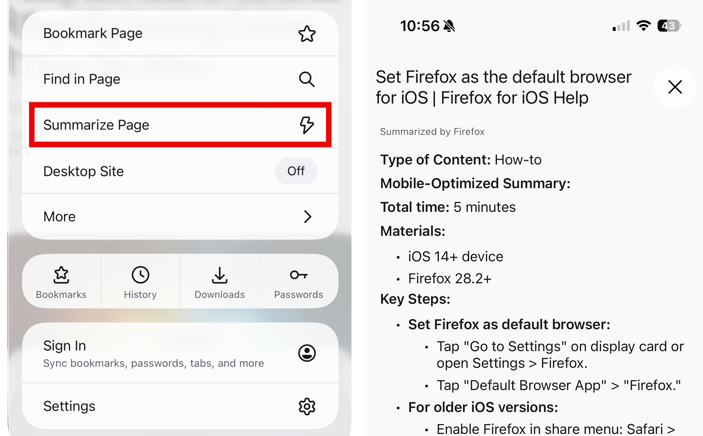 La funzione in questione, lo ricordiamo, consente di riassumere le pagine web in Firefox per iOS utilizzando l’intelligenza artificiale. Il browser in questione consente di ottenere in pochi attimi riassunti di articoli giornalistici, guide, recensioni e altro ancora quando si sceglie di riassumere quel tipo di contenuti sui dispositivi iOS.