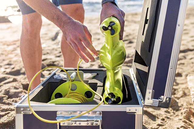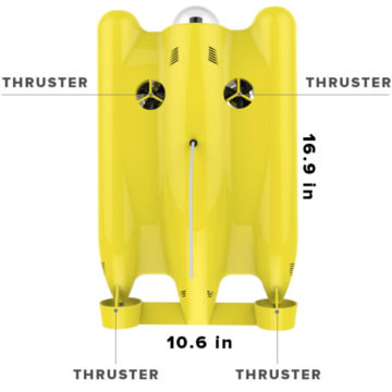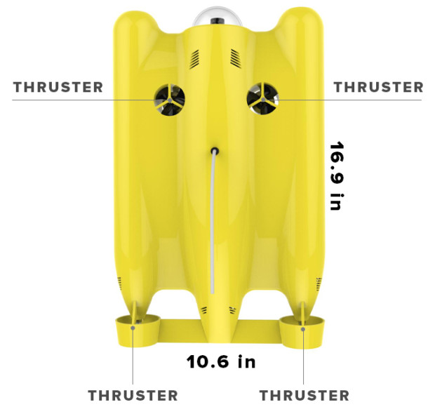 Il drone in sé, naturalmente, ha un form factor, e una filosofia costruttiva, completamente differente dai vari quadricotteri d’aria. In primis risulta ovviamente impermeabile, adatto per sopportare l’ambiente marino. A giudicare dalle immagini risulta piuttosto massiccio ed è collegato ad un cavo che permette di recuperarlo, quando si decide di riaffiorare in superficie. Si controlla con iPhone, con il supporto di un pad che sembra richiamare molti degli attuali controller MFi dedicati ai videogiochi.