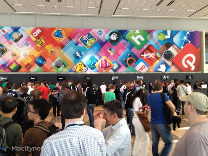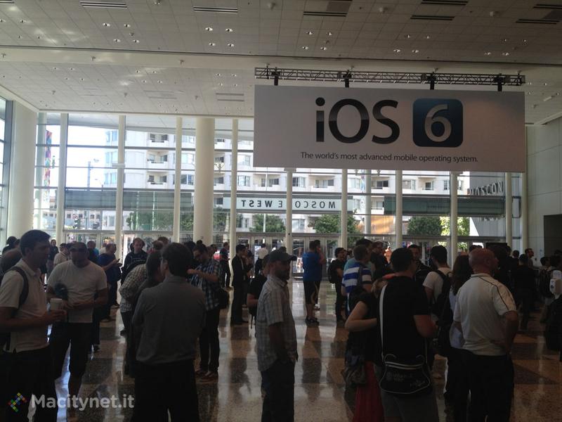 Nelle foto, mandateci dal nostro Antonio Dini, che pubblichiamo in questa pagina si notano alcuni dettagli; in particolare la persistenza dello striscione che inneggia ad iOS 6 scoperto l’altro giorno e che quindi non è stato svelato per errore, alle felpe che vegono distribuite come gadget a tutti gli iscritti all’evento.