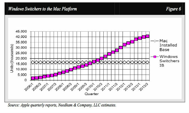 Wolf spiega che le dinamiche che in passato portavano a eseguire lo switching (il passaggio dal PC al Mac) non sono ora più valide. Benché nel mercato Mac si registri un declino di vendite minore rispetto al regresso rilevato generalmente nel mondo PC, il fattore “wow” si è affievolito e il Mac attira di meno gli utenti dei PC con Windows. Apple è stata avvantaggiata negli anni passati dall’effetto Halo di iPod e iPhone, tanto che a detta dell’analista questo ha contribuito nel 2005 allo switching di 40 milioni di utenti. Secondo dati in suo possesso, il 15% di proprietari di iPhone e iPad che ha un PC con Windows passerà al Mac, mentre il 20% sta valutando di farlo. Questi numeri in passato sarebbero stati molto più grandi ma il gap qualitativo in termine di esperienza utente tra Windows e OS X è percepito come non più così distante. Gli utenti sono al momento soddisfatti di quello che riescono a fare con i PC esistenti, anche quelli che ormai hanno qualche anno di anzianità, un problema che rallenta oltretutto il mercato generico dei PC. Gli utenti preferiscono risparmiare e, se devono spendere, comprano uno smartphone o un tablet. Il computer non è più visto come un dispositivo essenziale come in passato. In questa ottica Apple comunque continua a raccogliere benefici entrando in una dinamica si switch diversa, quella dal mondo PC al mondo degli schermi touch