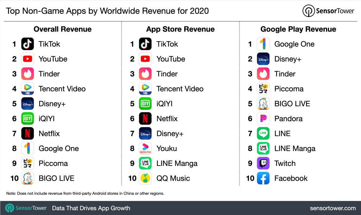 La crescita più impressionante nelle app che non sono giochi è di TikTok, incluso Douyin su iOS in Cina, che è aumentato di oltre il 600% incassando 1,2 miliardi di dollari su iPhone. Invece su dispositivi del robottino verde è Google One che aumenta del 41,9% incassando 444 milioni di dollari. Gli analisti di Sensor Tower (qui il report completo) indicano una crescita senza precedenti per i negozi digitali, spinta dalla crisi sanitaria globale che ha modificato bisogni e consumi delle persone, un cambiamento che potrebbe indicare un cambiamento permanente nelle abitudini di spesa degli utenti.