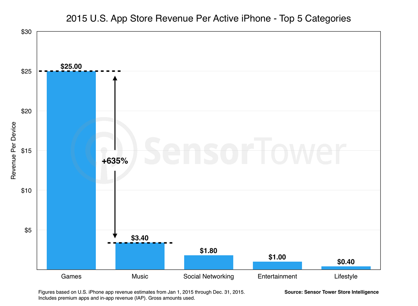 Dei 35 dollari spesi in media dagli utenti americani 25 sono dedicati ai Giochi, che resta la categoria più redditizia; in seconda posizione le app musicali, con una media di circa 3.4 dollari, meno di un sesto rispetto a quanto speso per i videogiochi. Social Networking, Intrattenimento e Lifestyle completano la top 5 rispettivamente a 1.80, 1, e 0.40 dollari spesi. Il resto viene invece distribuito in maniera variabile fra le restanti categorie.