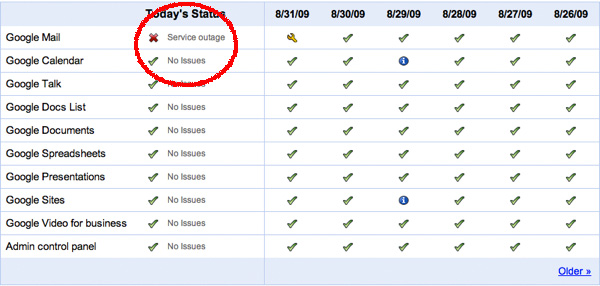 Questo dimostra quanto l’era del cloud computing, cioè dei servizi evoluti e dei mashup in rete che si manifestano sul singolo computer a prescindere (tutta la posta in rete come su Gmail, oppure i blog e via dicendo, mentre in sede locale non c’è niente se non un browser con cui accedere ai servizi stessi) hanno un gigantesco limite: cosa succede quando non funziona il collegamento o il server va giù? à il single point of failure, il singolo punto debole che può far crollare tutta la struttura. Come si vede nelle giornate andate male come oggi.