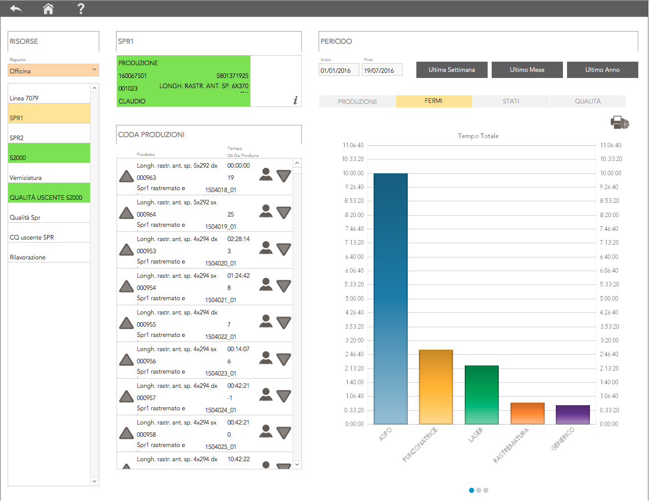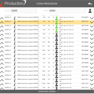 Il singolo operatore ha a disposizione delle funzioni che gli permettono di raccogliere i dati di produzione tramite iPad e FileMaker Go. In ogni stazione di raccolta dati l’operaio specializzato sceglie la risorsa macchina di cui raccogliere i dati, inserisce la propria password e, in questo modo, può vedere la coda di produzione assegnatagli; seleziona la commessa e registra i dati di produzione.