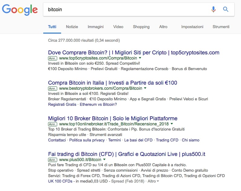 aGoogle ha fatto sapere che proibirà le pubblicità sulle criptovalute e le offerte iniziali di monete (ICO) a partire da giugno. La mossa è parte di un aggiornamento della politica che impedirà di acquistare spazi per altri prodotti finanziari rischiosi, oggi permessi: al momento, per esempio, digitando la query di ricerca “Bitcoin” vengono pubblicati diversi annunci nella parte superiore della pagina dei risultati di ricerca.