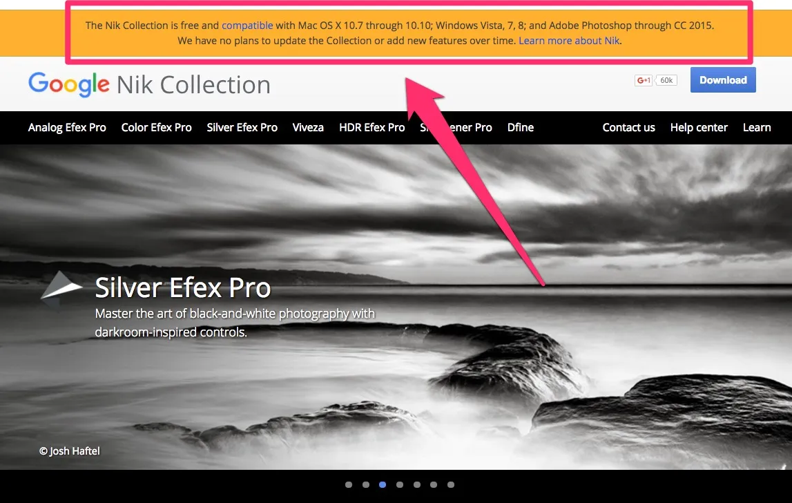 L’annuncio è stato dato in sordina con un banner presente nella parte superiore del sito Nik Collection (versione inglese), in cui è possibile leggere che non ci sono piani per aggiornare o aggiungere funzionalità alla collezione.
