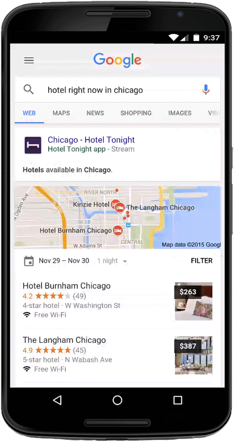 HotelTonight è un servizio disponibile solo su app e fino ad oggi non era possibile accedere all sue offerte digitando semplicemente una ricerca su Google. Presto non sarà più così: digitando ricerche specifiche, Google restituirà risultati dettagliati non solo dalle pagine web ma anche dalle app dedicate.