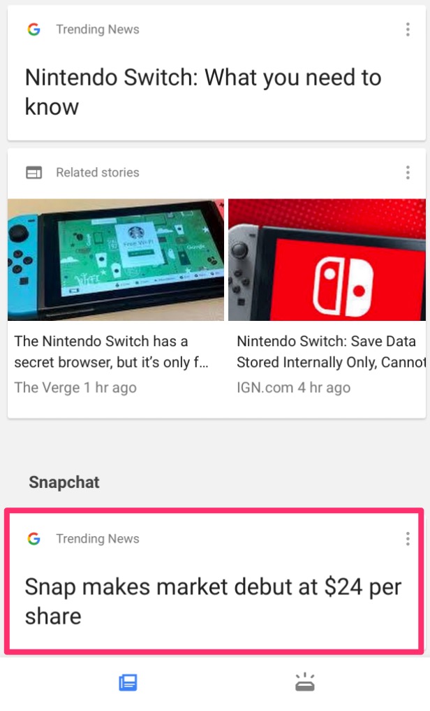 Le cards sono poste al di sopra della serie regolare di notizie che normalmente appaiono quando si apre l’applicazione, o toccando il pulsante “G” in basso al centro. Sulla base di quello che è stato riscontrato, le card delle trending news sono rilevanti non solo per quelle che sono effettivamente le notizie di tendenza, ma anche in relazione a quelle che sono state le recenti ricerche degli utenti, il che conferma che Google decide di mostrare gli argomenti delle notizie di tendenza anche in base alla cronologia di ricerca salvata per ogni utente.