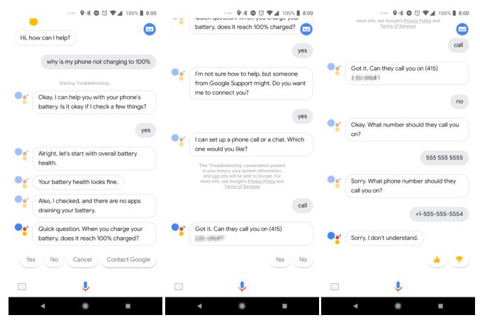 Una volta completato, l’Assistente ha visualizzato un’opzione per connettere l’utente all’Assistenza Google tramite telefono o chat. Il sistema sembra abbastanza intuitivo, l’unico problema minore è che l’Assistente non ha riconosciuto l’immissione di un numero di telefono quando richiesto.