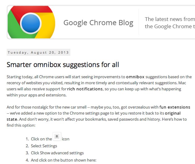 Inoltre tutti gli utenti Mac che useranno Google Chrome 29 riceveranno anche il supporto per le notifiche più evolute, in modo da poter tenere sempre sotto controllo quello che sta succedendo alle applicazioni e le estensioni. E’ stato anche inserito un nuovo pulsante nelle impostazioni che consente di ripristinare di nuovo il browser al suo stato originale nel caso in cui si abbia esagerato ammassando opzioni ed estensioni senza controllo. Utile nel caso in cui si volesse fare piazza pulita in un colpo solo, senza però perdere altri dati utili, come temi, segnalibri o applicazioni.