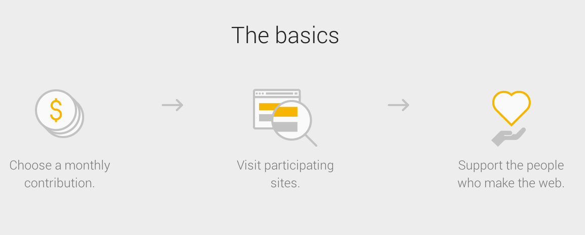L’utente potrà scegliere il contributo da 1 a 3 dollari da lasciare ogni mese e vedrà comparire sul proprio dispositivo un messaggio di ringraziamento da parte del sito partner, con un modello predefinito al posto del classico banner pubblicitario. Quindi si formerà una specie di finanziamento diretto tra l’utente ed il creatore di contenuti senza passare attraverso l’annuncio pubblicitario.