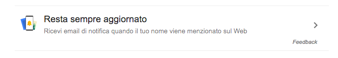 Quando un utente loggato cerca il proprio nome su Google, il motore di ricerca aggiunge ora una casella alla fine dei risultati della ricerca, per far sapere all’utente che è possibile tenere traccia di nuove menzioni che appaiono man mano online.
