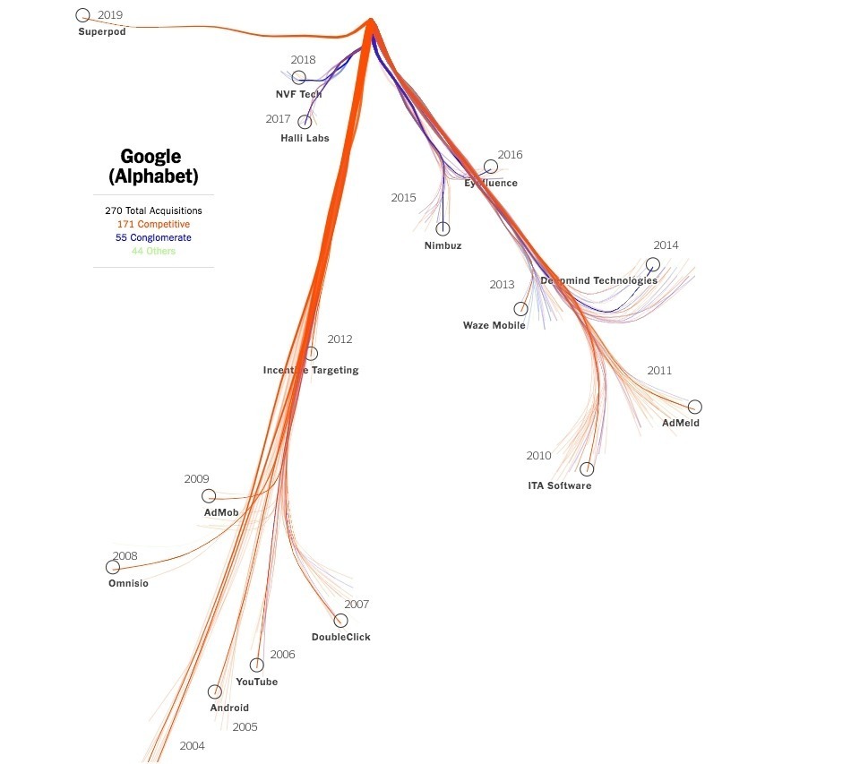 Google (o Alphabet che dir si voglia) ha completato dalla sua nascita 270 acquisizioni, in alcuni momenti con frequenze molto elevate: si stima che nel 2010 Google abbia acquisito un’azienda ogni 10 giorni. Ben 171 delle 270 aziende acquisite erano concorrenti diretti di Google e dei suoi servizi e fra queste rientrano alcune delle maggiori acquisizioni dell’azienda.
