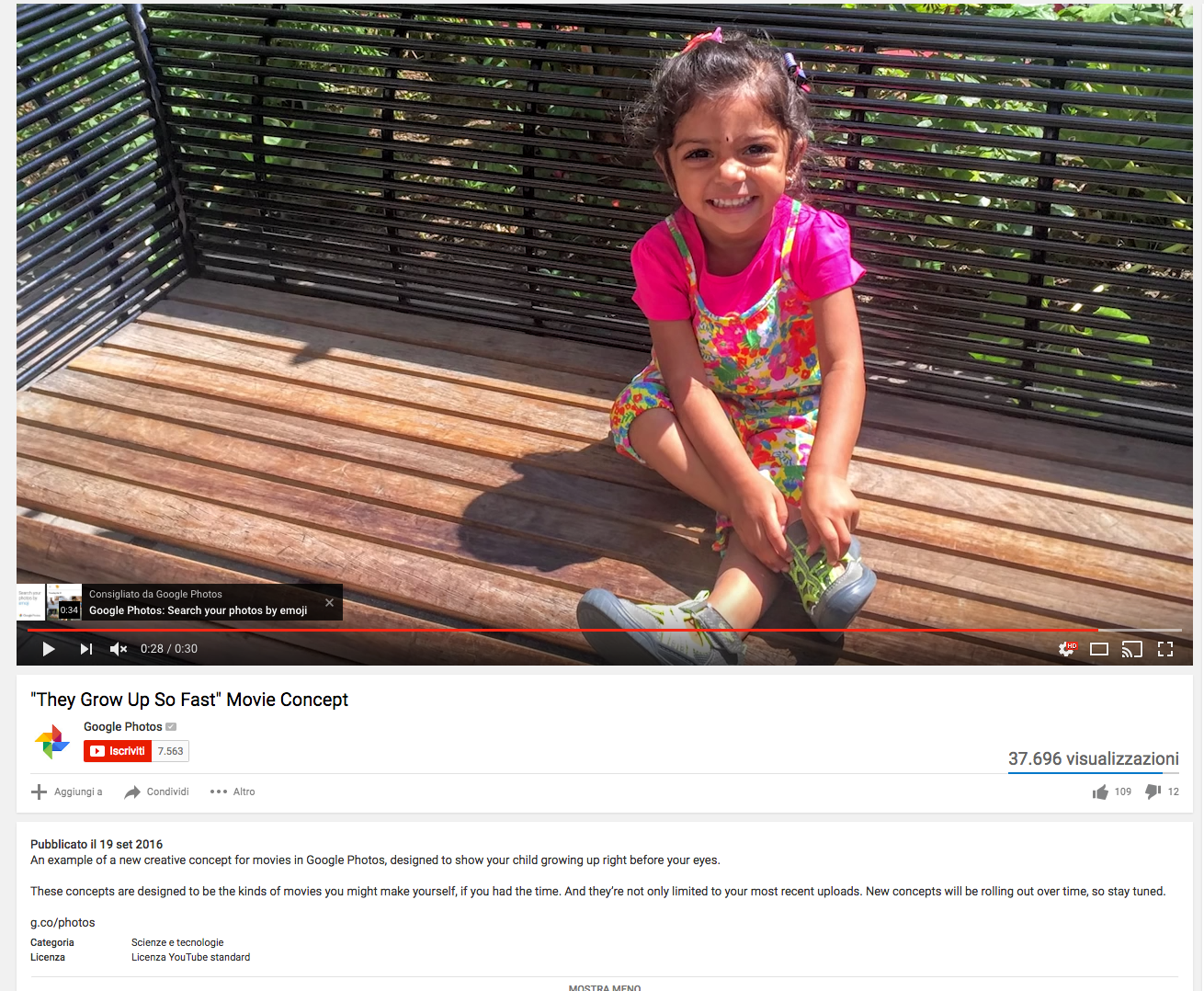 Il primo esempio si chiama They Grow Up So Fast (visibile in coda all’articolo) e mostra le immagini di alcuni bambini durante la loro fase di crescita, realizzando così un collage di immagini che permette di ripercorrere i momenti salienti della vita di un bimbo. Una funzione molto utile per un genitore che vuole immortalare il proprio figlio che cresce, il tutto automaticamente: sarà Google ad analizzare le immagini e creare il filmato.