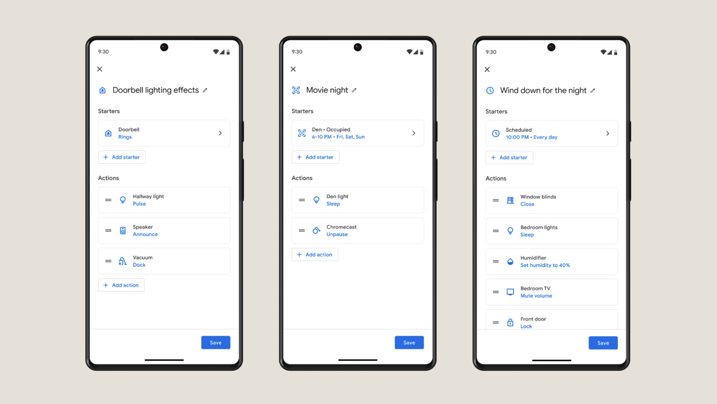 Le nuove azioni includono l’apertura o la chiusura dei dispositivi come le tende, la messa in pausa o la ripresa dei media, l’avvio o messa in pausa o ripresa dei timer, il collegamento dei dispositivi, l’abilitazione di effetti luminosi, il riavvio dei dispositivi, la configurazione delle percentuali di umidità desiderate, e altre ancora. E’ possibile consultare l’elenco completo delle nuove funzioni di avvio e delle azioni nel post sul blog di Google.