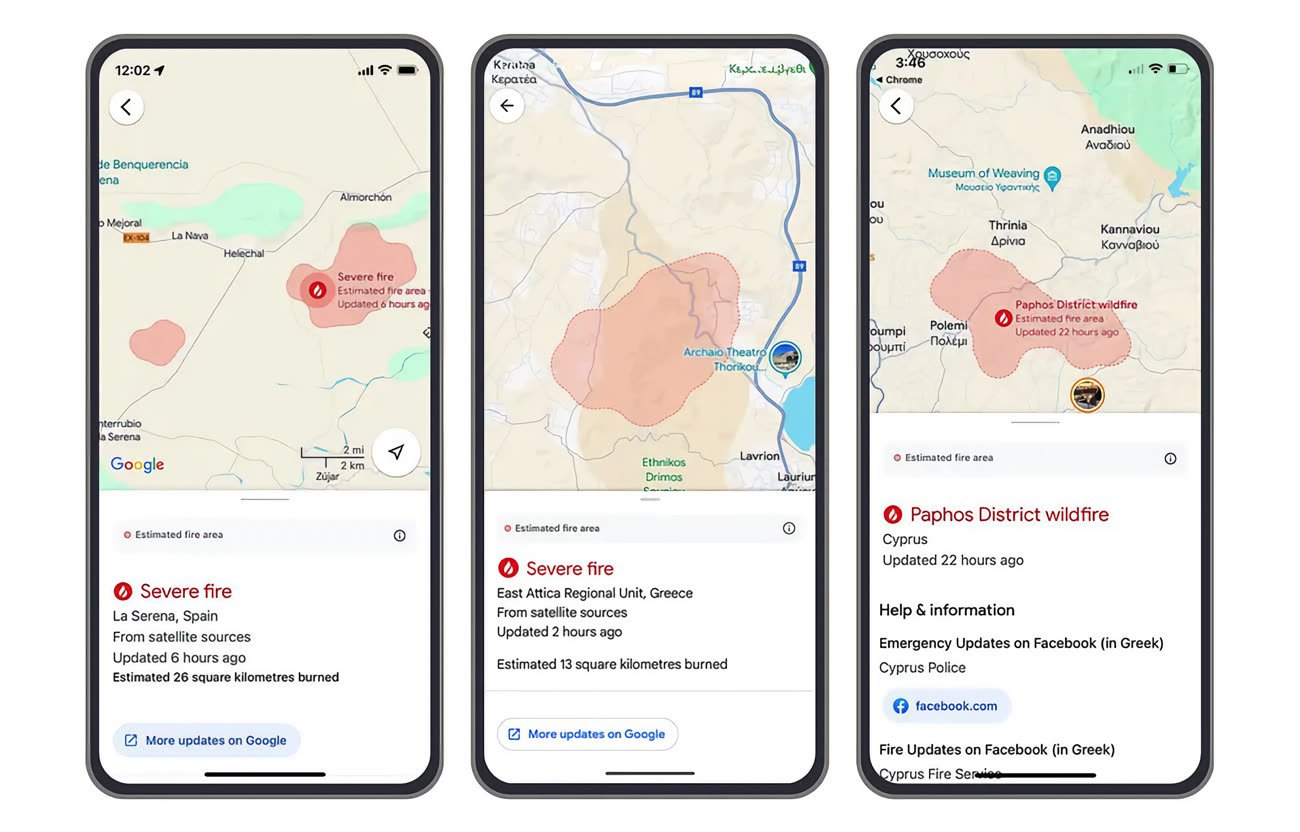 Più utile forse la funzione che permetterà in Google Maps di i visualizzare le mappe degli incendi boschivi e soprattutto le loro posizioni precise in 15 nuovi paesi (Italia inclusa). Queste informazioni vengono rese disponibili attraverso alert e funzionalità che comunicano alle persone che si trovano nei pressi di un incendio boschivo dettagli su come rimanere al sicuro.