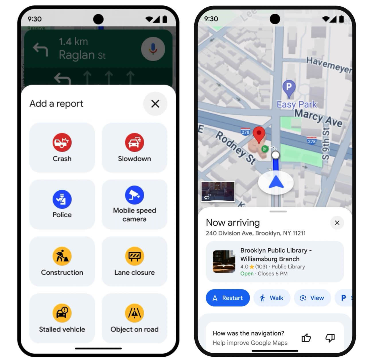 Diverse novità sono previste in arrivo per Google Maps, a partire da un sistema per segnalare incidenti che ricorda molto una funzionalità simile di Waze (app di navigazione basata sulla community acquisita da Google nel 2013). Al pari di Waze, grazie alle reti di conducenti, sarà possibile o ottenere avvisi in caso di traffico, lavori in corso, incidenti, posti di blocco e altro ancora, tutto passando per grandi icone dedicate, facili da gestire anche durante la guida.
