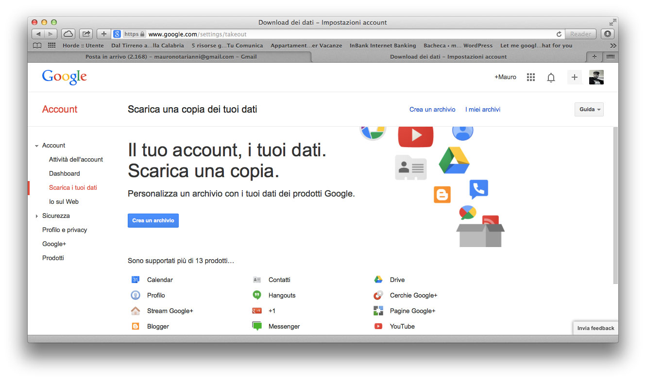 Per eseguire la copia basta accedere al proprio account Gmail, visualizzare il proprio profilo, selezionare la voce “Scarica i tuoi dati”. Facendo click su Crea un archivio”, è possibile selezionare i prodotti Google di cui si desidera scaricare i dati e configurare le impostazioni di download per ogni prodotto.