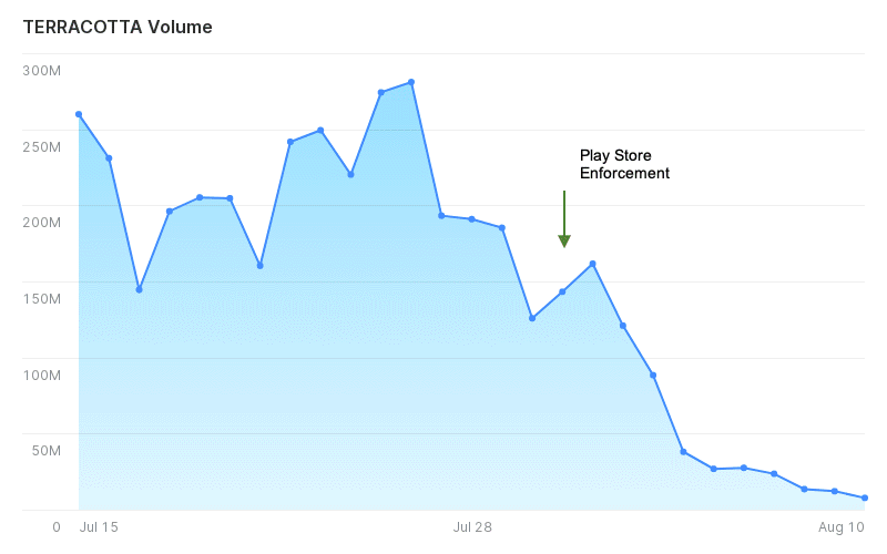 Terracotta operava distribuendo sul Play Store app che promettevano oggetti gratuiti e altri benefici agli utenti che installavano le app sui loro dispositivi. Le app in questione tipicamente proponevano scarpe, stivali, scarpe da tennis e a volte anche biglietti, coupon e costose cure dentali. Gli utenti venivano convinti della necessità di installare le app e aspettare fino a due settimane per ricevere prodotti e servizi gratuiti, un modo per invogliarli a non cancellare nel frattempo le app dai telefoni.