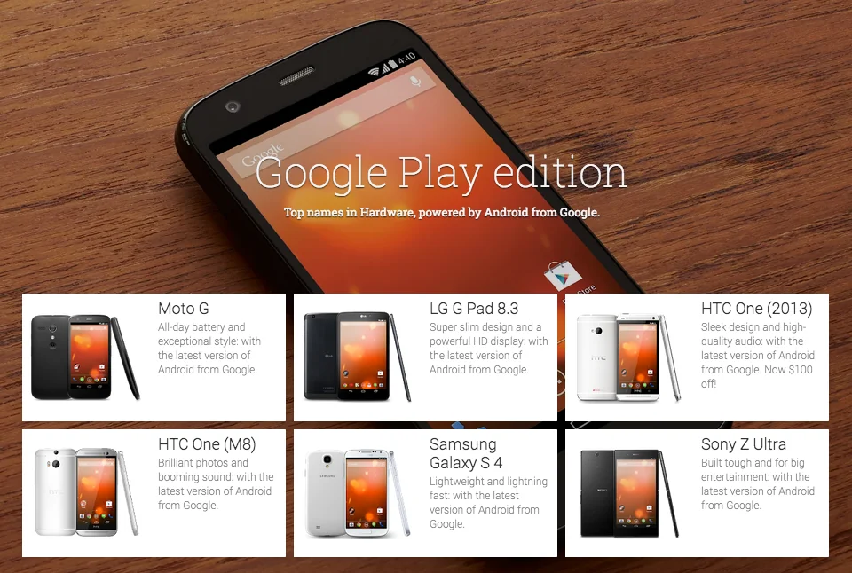 Il programma Google Play Edition, che consentiva agli utenti di acquistare smartphone popolari dotati però della versione base di Android, ovvero senza le personalizzazioni dei produttori, potrebbe essere agli sgoccioli. Secondo quanto riportato da Phandroid, il Samsung Galaxy S4 non è più disponibile su Play Store; allo stesso modo sembra che Samsung non abbia interesse a portare il successore, il Samsung Galaxy S5, su Play Store, lasciando solo HTC One M8 come unico dispositivo acquistabile su Play Store, oltre ovviamente ai dispositivi Nexus.