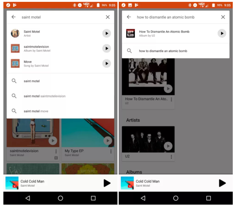 Con questa funzione, se si cerca una canzone, un album o un artista, i primi tre risultati nel menu a discesa mostreranno i risultati di Play Music con l’illustrazione a sinistra e un pulsante di riproduzione a destra. Se i risultati sono per una canzone o un album, toccando il tasto play la riproduzione inizierà automaticamente. Se si tratta di un artista, la musica verrà riprodotta in modalità casuale.