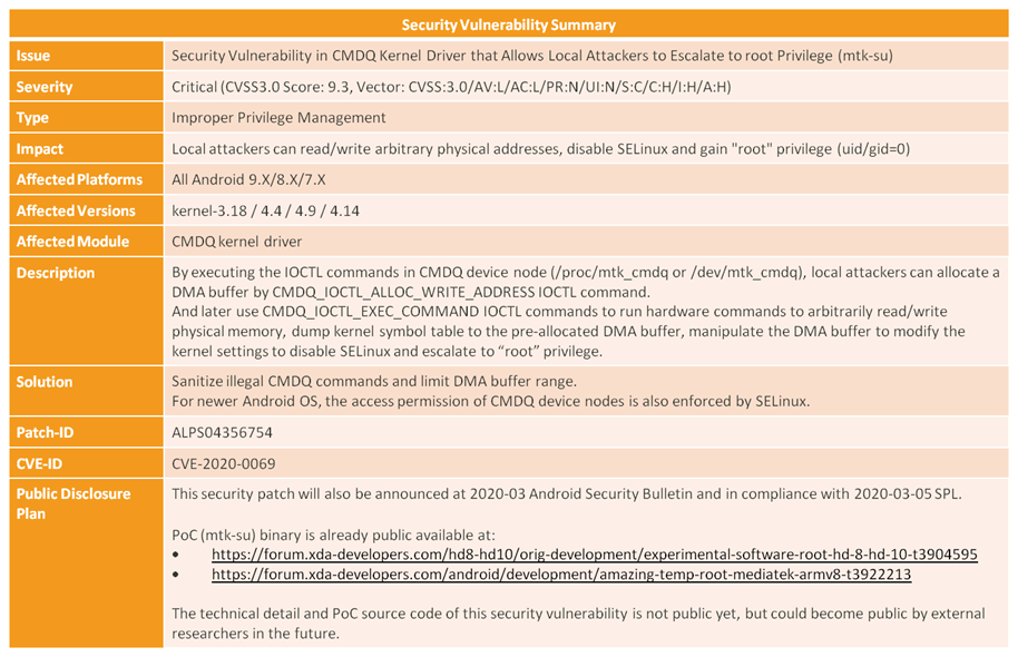 Nel dizionario delle vulnerabilità CVE (Common Vulnerabilities and Exposures), Google spiega nell’identificatore CVE-2020-0069 che la patch è integrata nell’aggiornamento di marzo. Google riferisce pubblicamente solo ora del problema ma l’esistenza della vulnerabilità è nota da mesi. La vulnerabilità in questione è modo sfruttabile su decine di modelli diversi di dispositivi e cybercriminali sarebbero da tempo all’opera per sfruttarla. Per molti dispositivi bisogna attendere e sperare che i rispettivi produttori rilascino aggiornamenti.