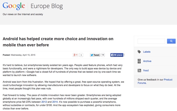 “Android è stato un attore chiave stimolando la concorrenza e la scelta, abbassando i prezzi e aumentando la scelta per tutti (ci sono oltre 18.000 diversi dispositivi disponibili oggi)” si legge nel post. Google punta sul alcune caratteristiche di Android ovvero il fatto che il sistema operativo sia gratuito e open source, la presenza di milioni di app su Google Play, la presenza di applicazioni che offrono concorrenza ai rivali, come Facebook, Expedia, Microsoft Office, e la scelta delle piattaforme da usare per gli sviluppatori.
