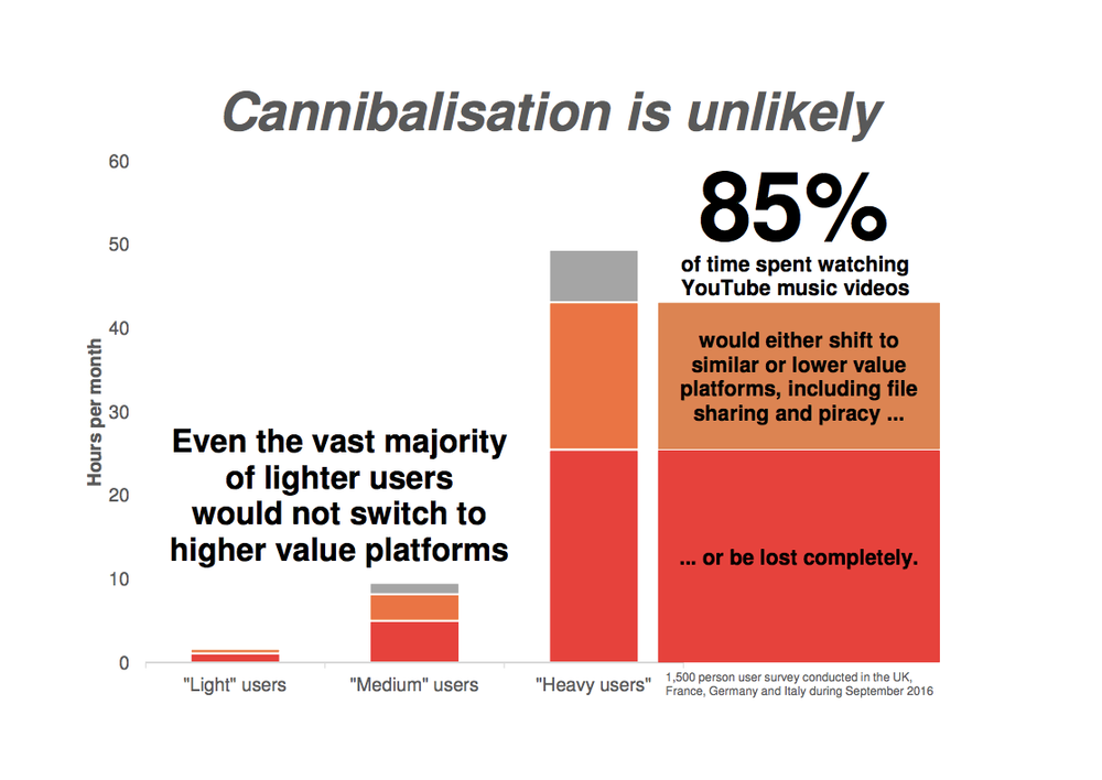 Nella prima pubblicazione, RBB esamina la questione della cannibalizzazione ovvero l’ipotesi che chi ascolta musica su YouTube sia portato a non usare altri servizi economicamente più interessanti per il settore. Lo studio conclude che non ci sia rischio di cannibalizzazione, anzi: se YouTube non esistesse, l’85% del tempo trascorso dalle persone su YouTube si sposterebbe verso canali di valore inferiore e si tradurrebbe in un significativo aumento della pirateria.